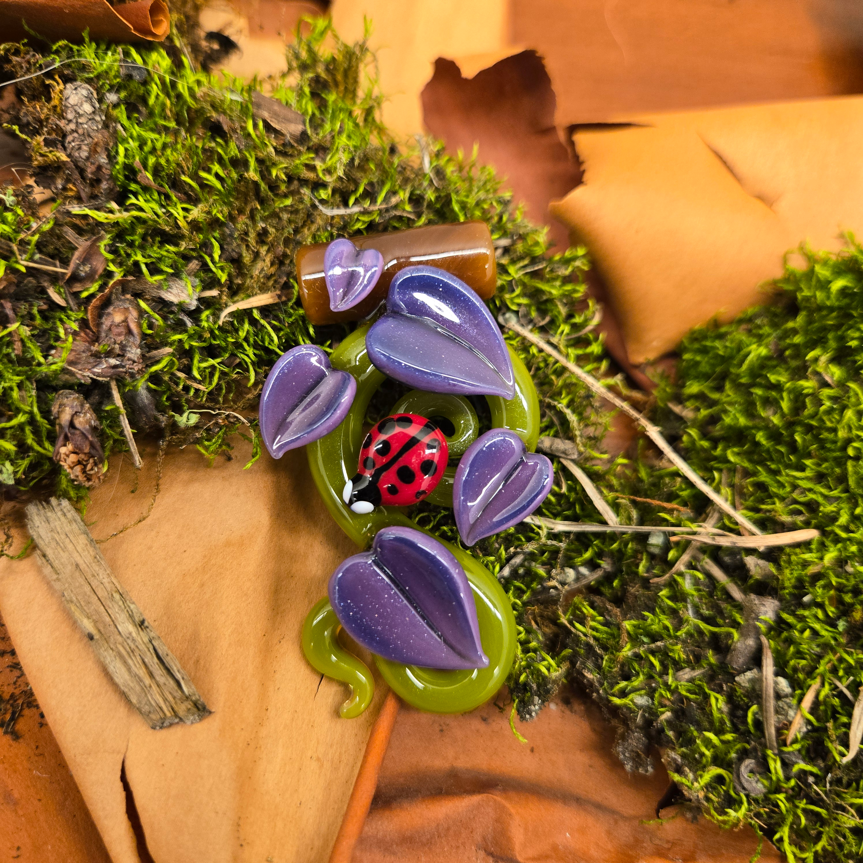The Ladybug Pendant by Jupiter Nielsen is a charming and intricate piece that embodies the beauty of nature in a wearable form. Featuring a swirling green base accented with delicate purple leaves, this pendant brings the natural world to life. Nestled among the leaves is a detailed ladybug, adding a touch of whimsy and vibrancy to the design. Handcrafted from durable borosilicate glass, the pendant showcases the artist’s expertise in flameworking, capturing fine details and dynamic color contrasts.