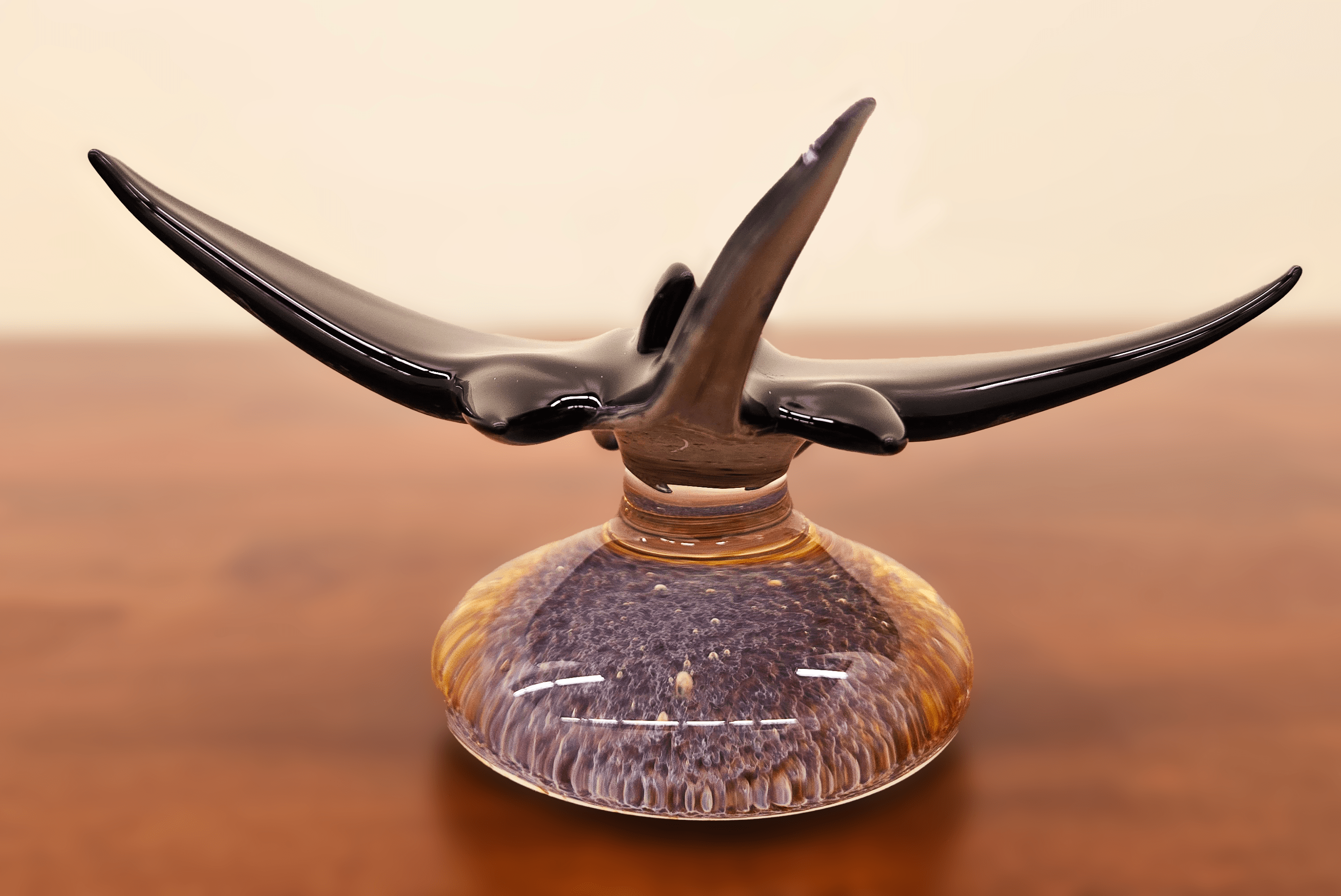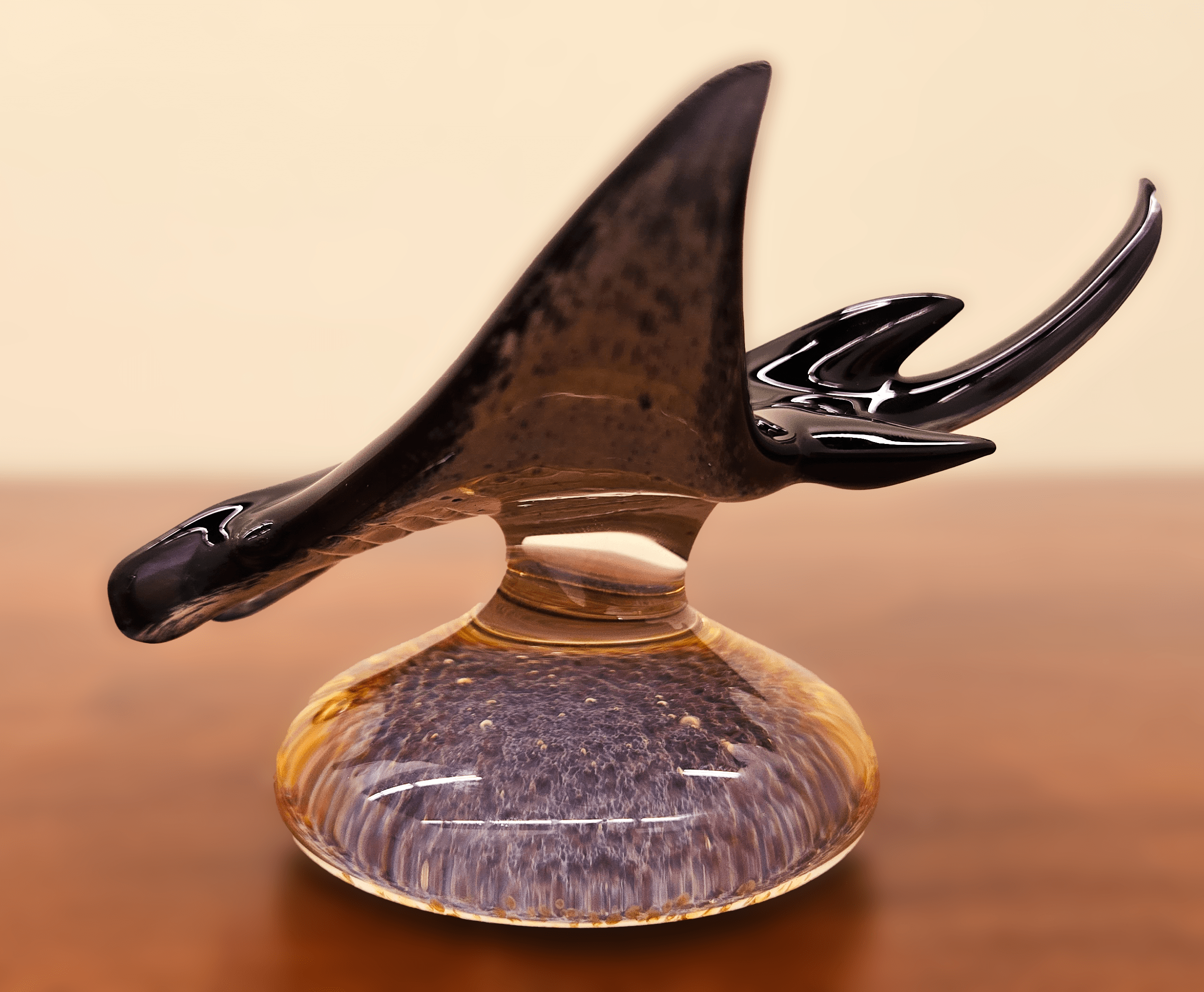Medium Manta Ray on Frit Base is a striking glass sculpture that beautifully embodies the graceful movement of this majestic sea creature. Handcrafted from borosilicate glass, the manta ray features sleek, flowing lines and a lifelike form, suspended elegantly above a colorful frit base that mimics the vibrant ocean floor. The base’s multicolored glass frit adds visual depth and contrast, making the sculpture a dynamic centerpiece that catches the eye from every angle.