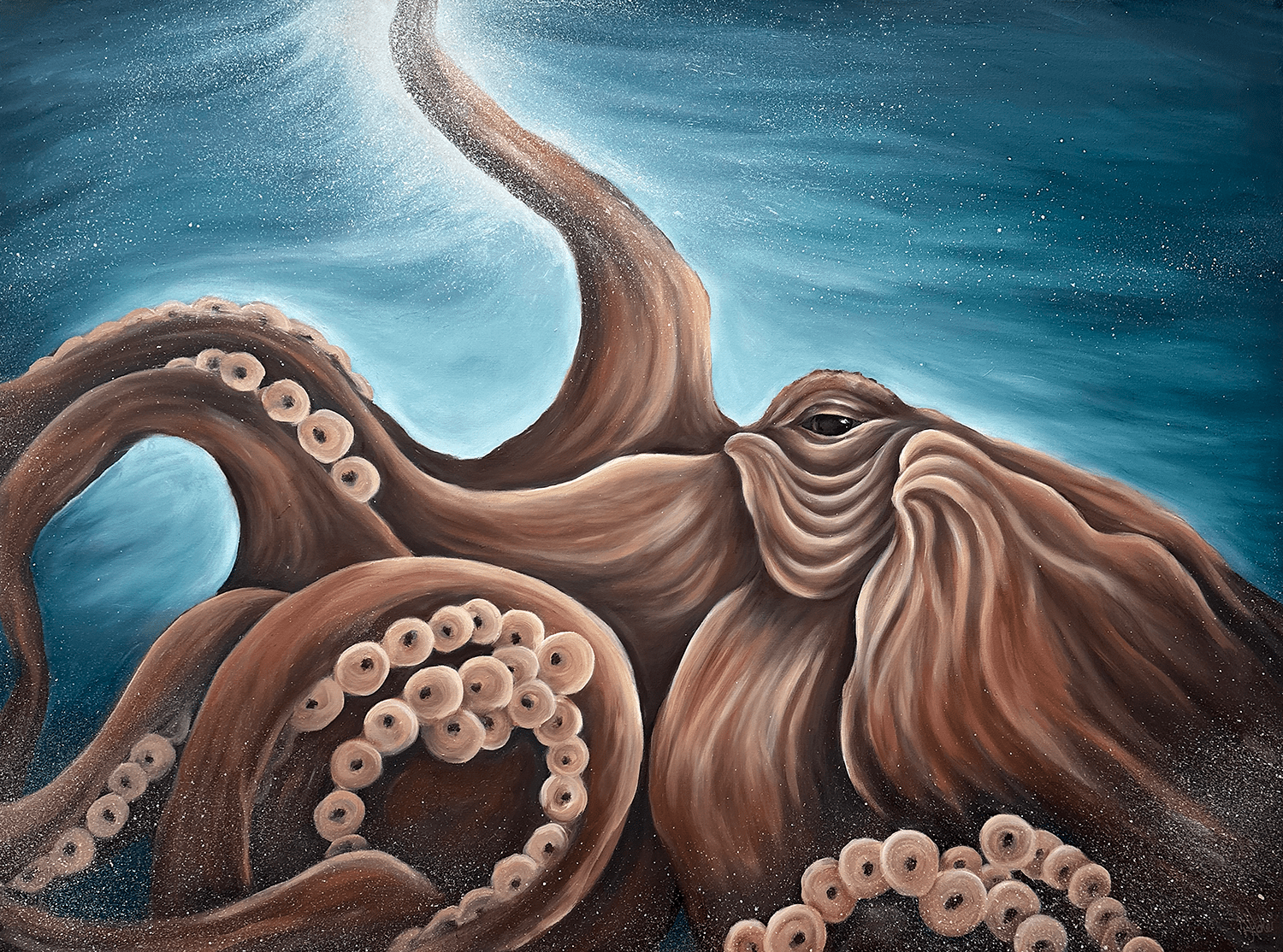 The Octopus: calm clarity, compassion and creative intelligence. I have always been fascinated by their aura, their smooth movement, their character, and feel connected to the lessons they offer. Orly, here, was drawn from years of painting octopus, mostly from reference sketches from the Seattle Aquarium’s OctoCam program, when I got the privilege of a rare glimpse from the dock in Friday Harbor. Drawing from the amazing stories I connect with such as Octopus Teacher and The Soul of an Octopus.