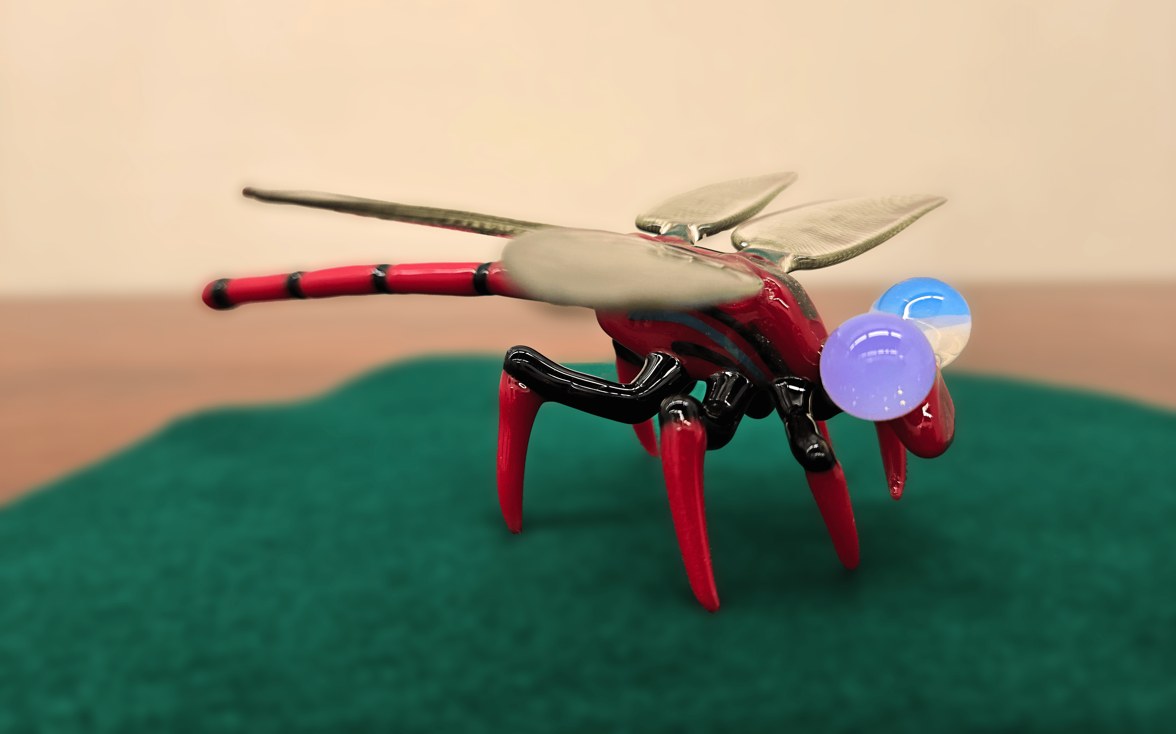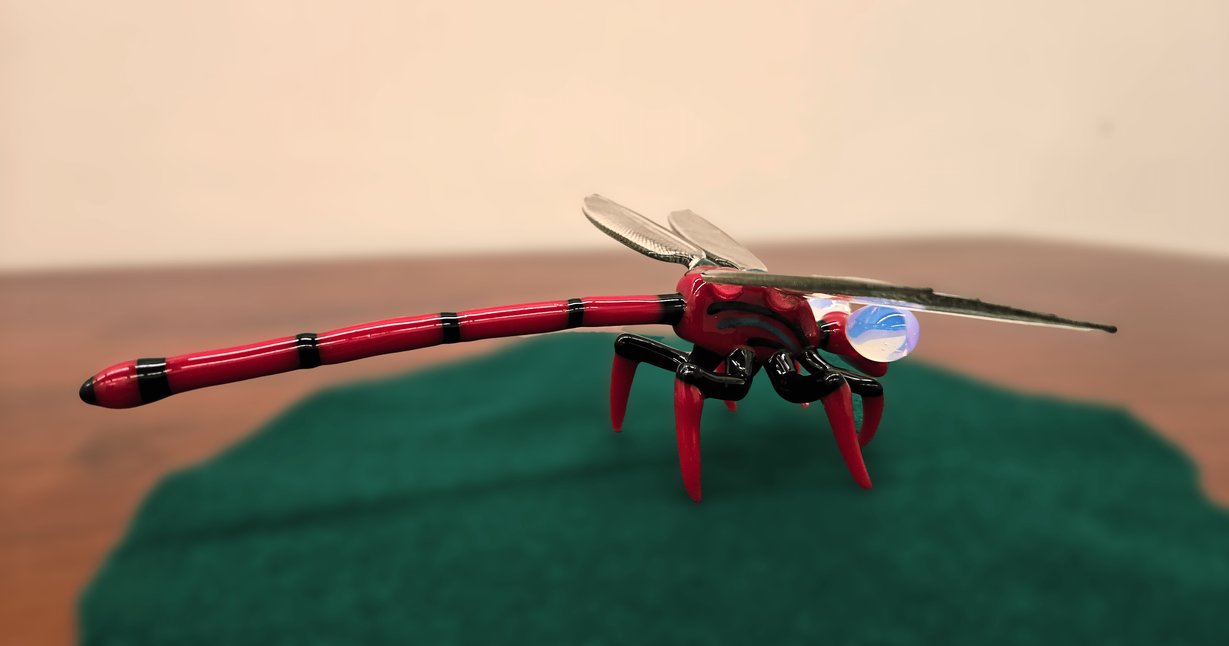Red Dragonfly is a stunning glass sculpture that captures the vibrant energy and delicate nature of this striking insect. Handcrafted with a deep, rich red body, this sculpture exemplifies the artist’s expertise in flameworking and attention to detail. The wings, intricately designed with fine patterns, feature a subtle iridescence achieved through a delicate application of fine metal aerosolized in the flame, giving them a mesmerizing, luminous quality.