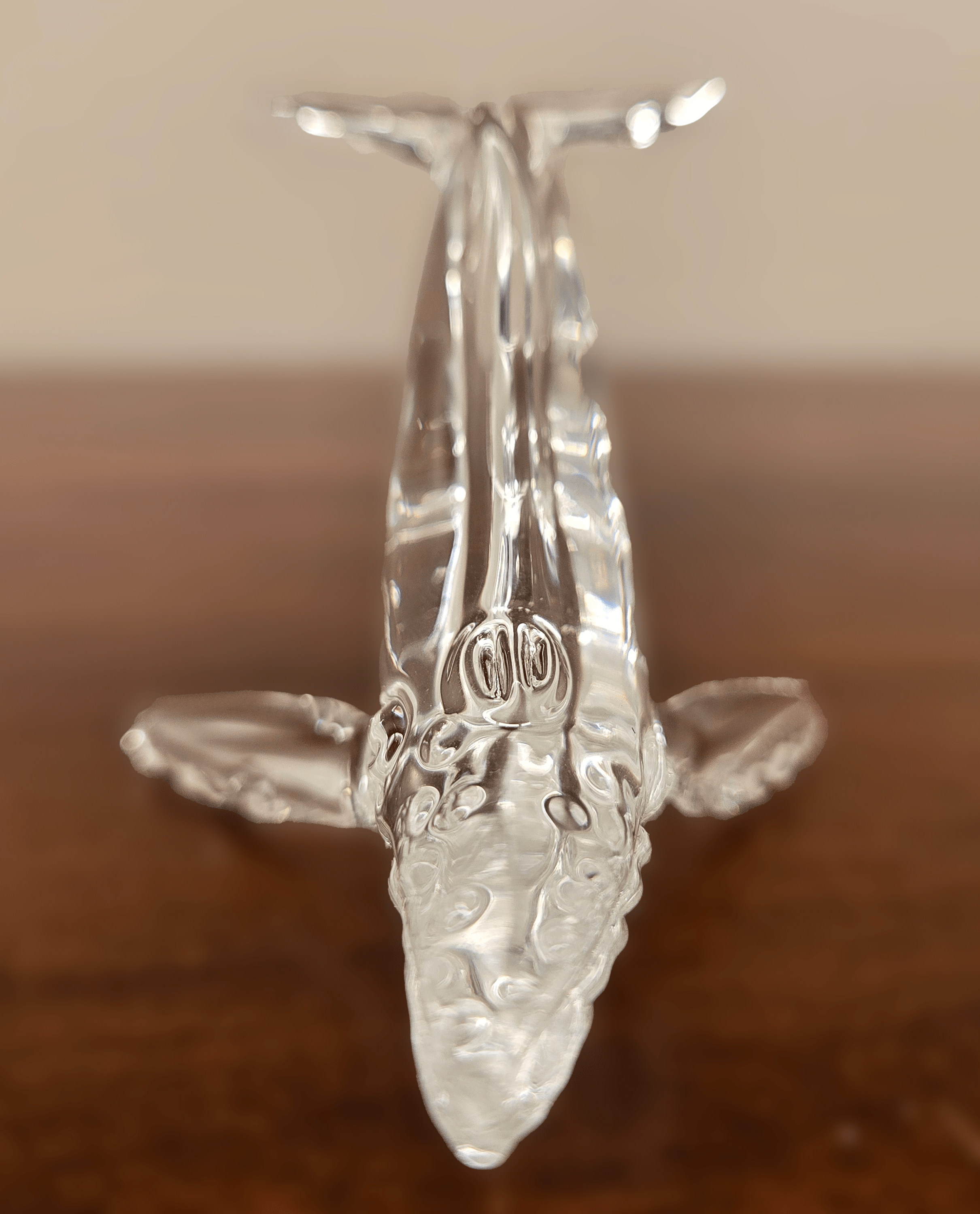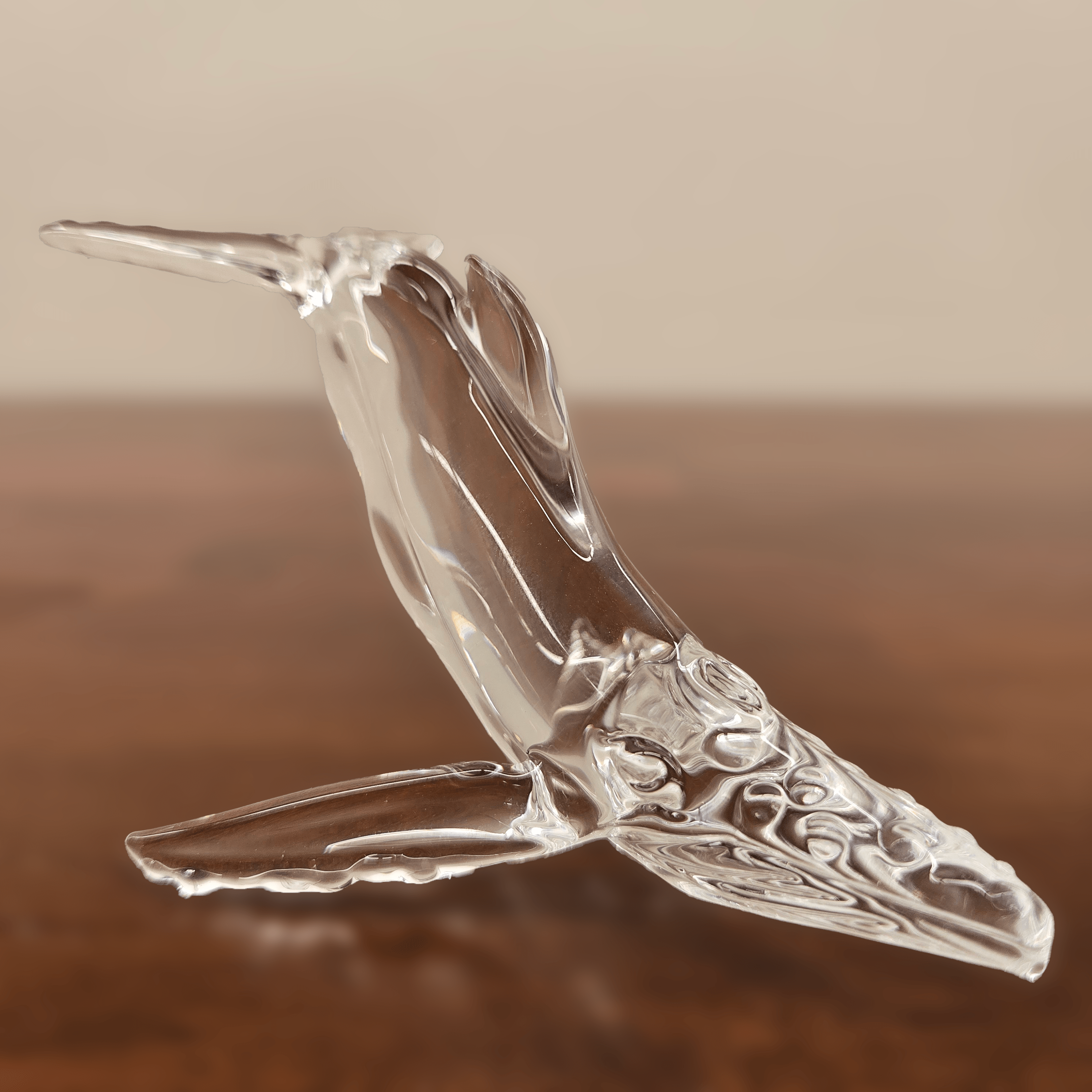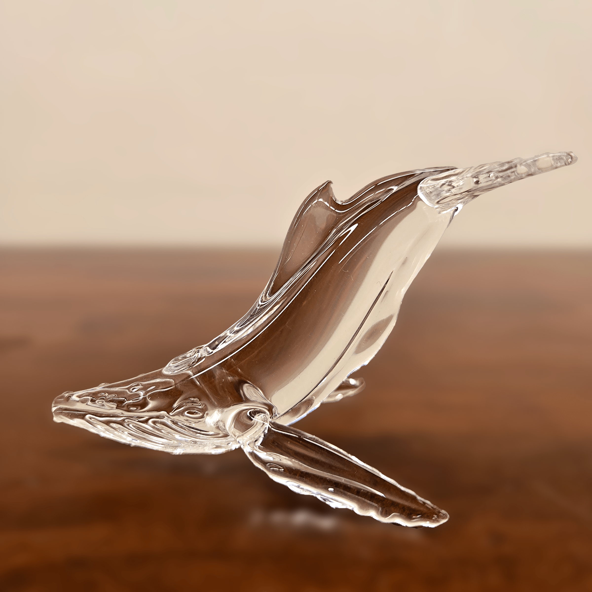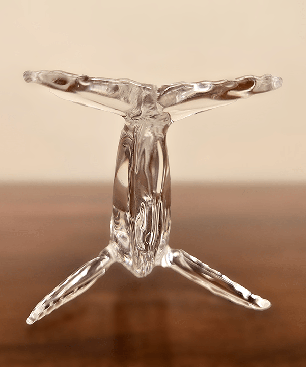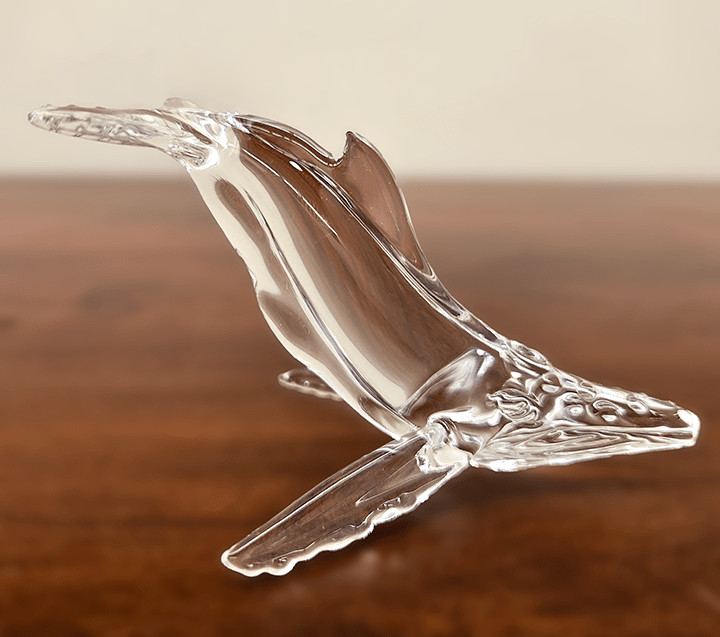 Small Humpback is a stunning glass sculpture showcasing expert flameworking skills. Made from borosilicate glass, this piece captures the majestic essence of a single humpback whale. The elegant, fluid form conveys the whale’s graceful movement through the ocean, highlighted by the way light interacts with the transparent glass. The sculpture’s lifelike detail and artistry make it a captivating piece that evokes the serenity and mystery of the sea.